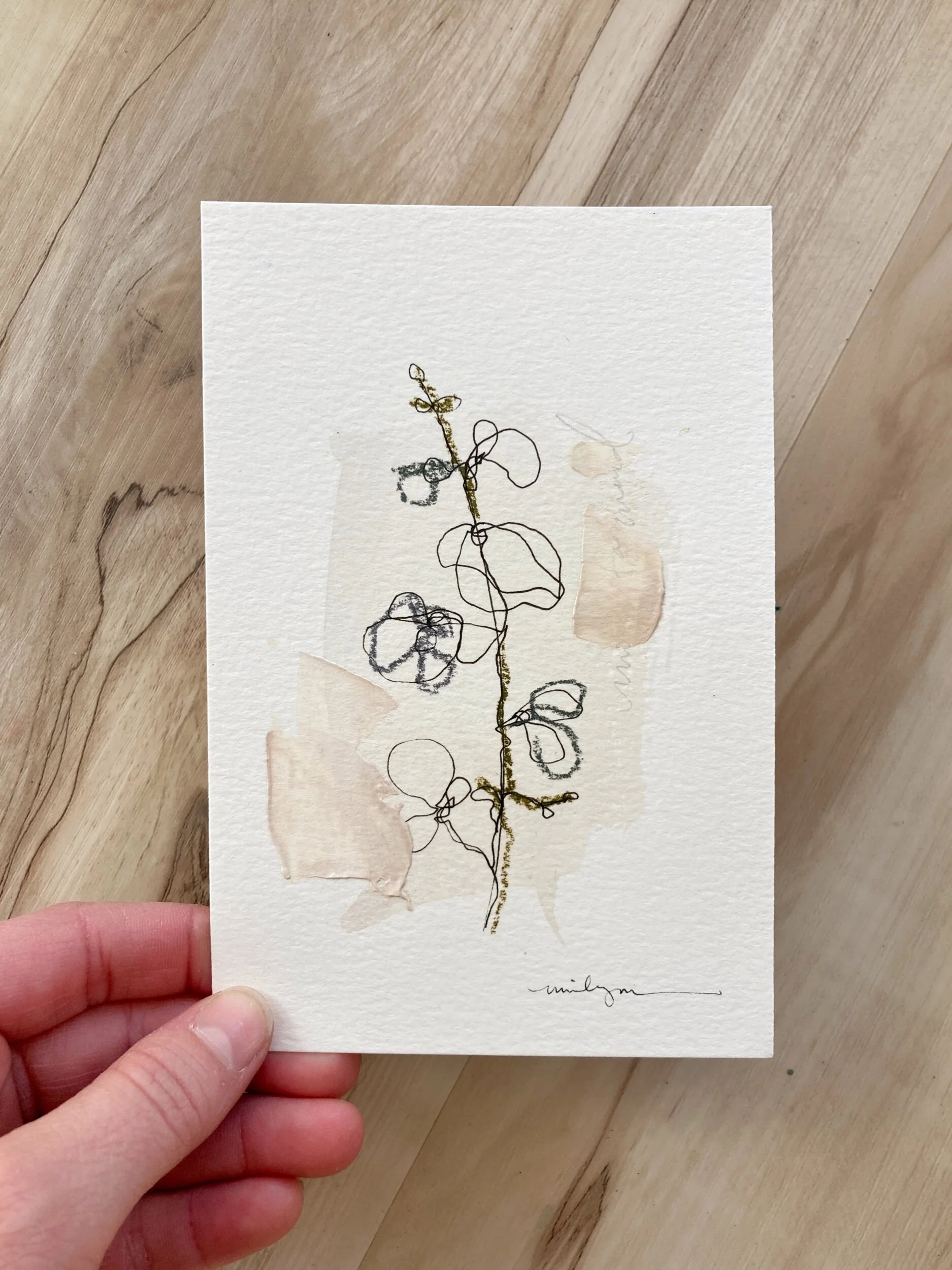 The abstract minis collection stems from a desire to streamline and perfect my process while inspiring my own creativity in a zero pressure practice. Each abstract was created in a small series with the same color palette. The process starts with a foundation of watercolor brush strokes and washes in 1-3 various pigments. The second step I take is adding line work and markings. This step is done with charcoal, pastels, or pen and ink. Each piece is completed with fun blotches of texture, bringing the piece to life, making it jump off the tiny masterpiece.
