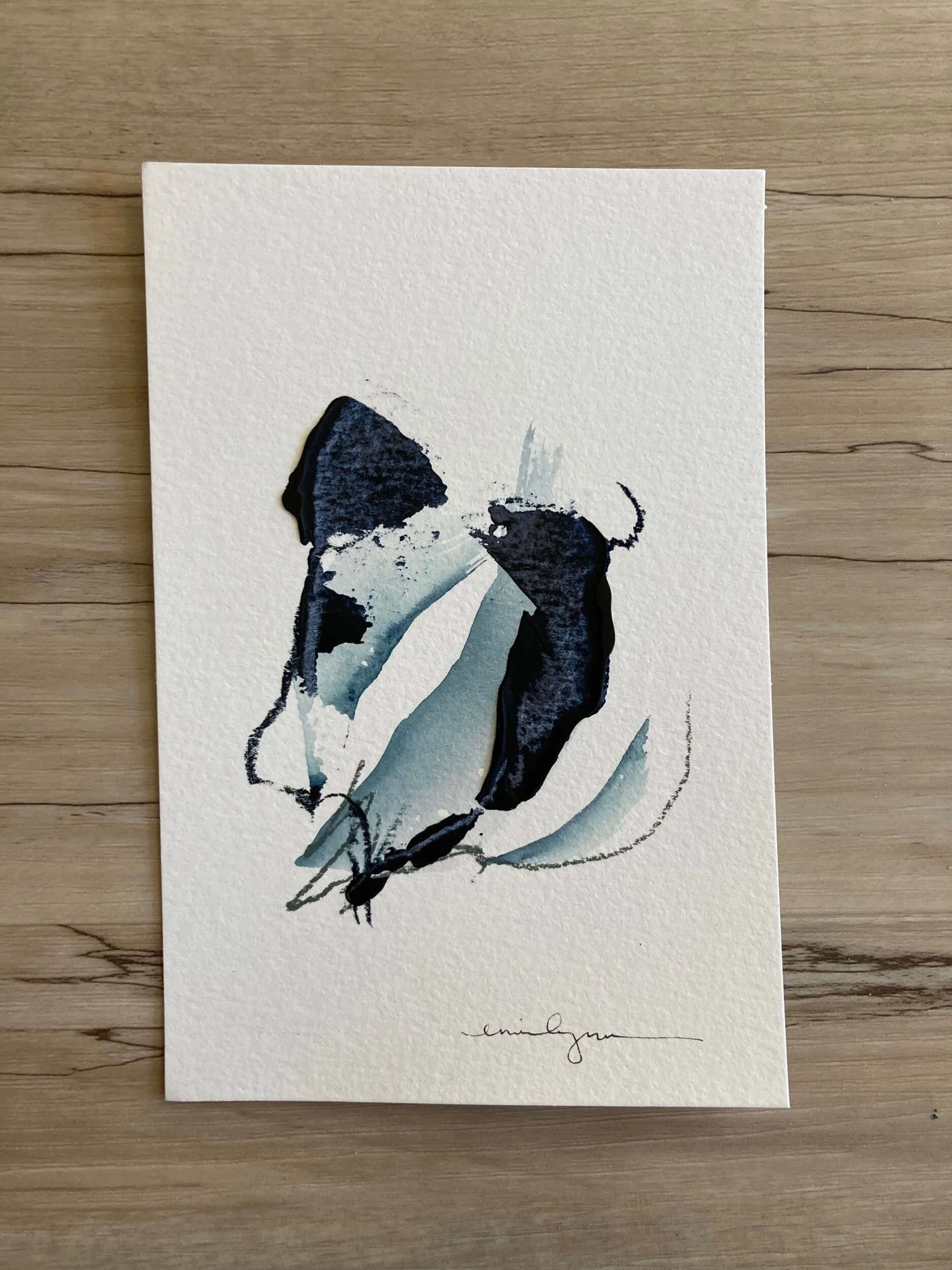 The abstract minis collection stems from a desire to streamline and perfect my process while inspiring my own creativity in a zero pressure practice. Each abstract was created in a small series with the same color palette. The process starts with a foundation of watercolor brush strokes and washes in 1-3 various pigments. The second step I take is adding line work and markings. This step is done with charcoal, pastels, or pen and ink. Each piece is completed with fun blotches of texture, bringing the piece to life, making it jump off the tiny masterpiece.