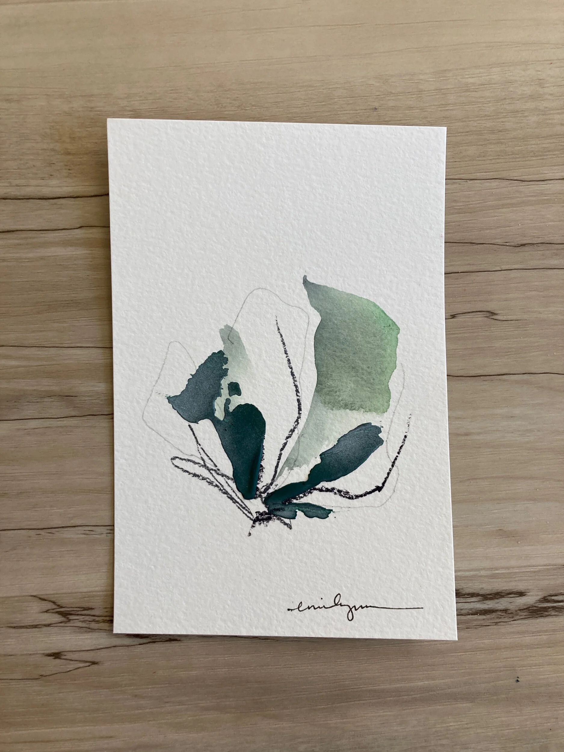 The abstract minis collection stems from a desire to streamline and perfect my process while inspiring my own creativity in a zero pressure practice. Each abstract was created in a small series with the same color palette. The process starts with a foundation of watercolor brush strokes and washes in 1-3 various pigments. The second step I take is adding line work and markings. This step is done with charcoal, pastels, or pen and ink. Each piece is completed with fun blotches of texture, bringing the piece to life, making it jump off the tiny masterpiece.