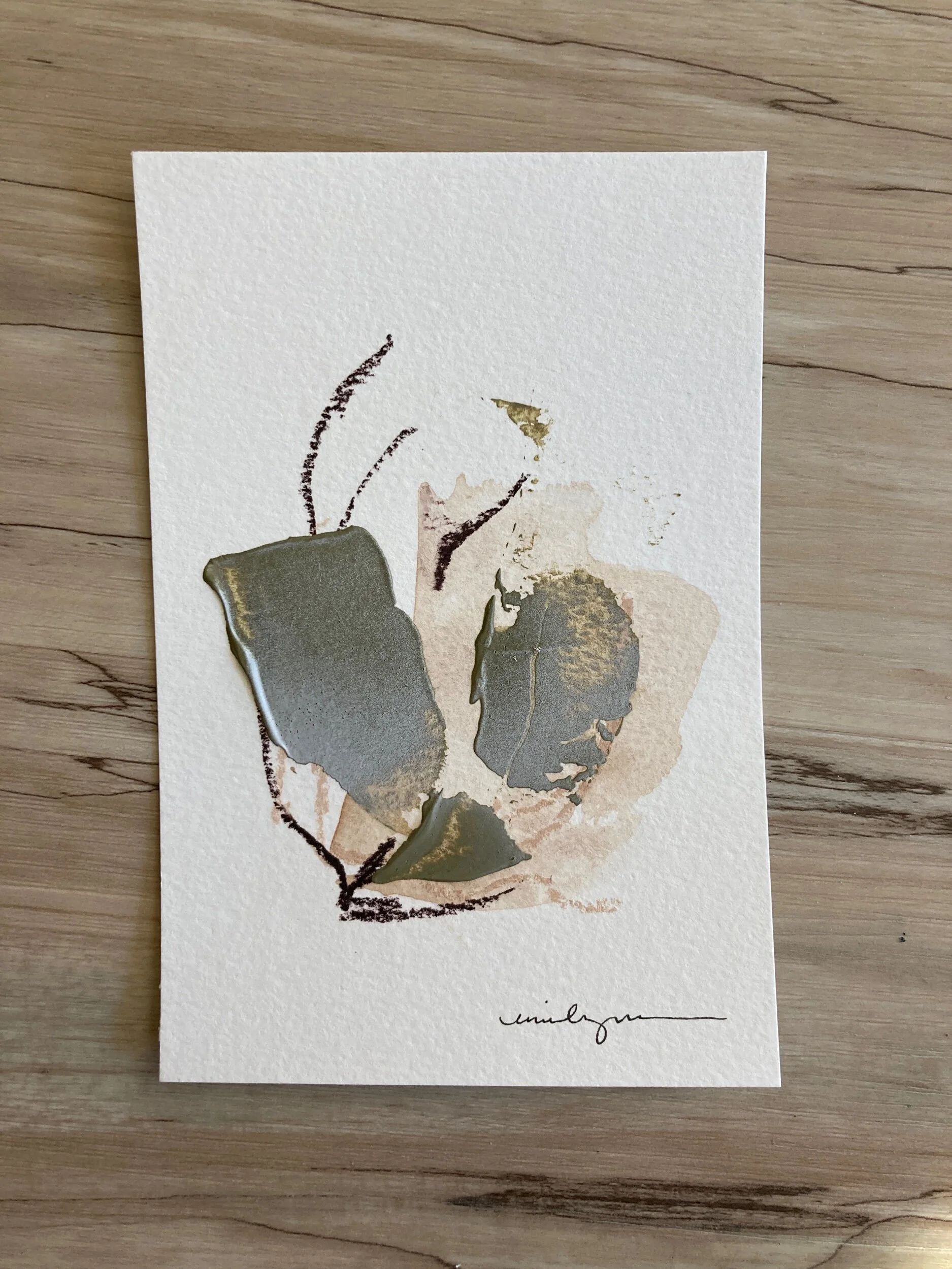 The abstract minis collection stems from a desire to streamline and perfect my process while inspiring my own creativity in a zero pressure practice. Each abstract was created in a small series with the same color palette. The process starts with a foundation of watercolor brush strokes and washes in 1-3 various pigments. The second step I take is adding line work and markings. This step is done with charcoal, pastels, or pen and ink. Each piece is completed with fun blotches of texture, bringing the piece to life, making it jump off the tiny masterpiece.