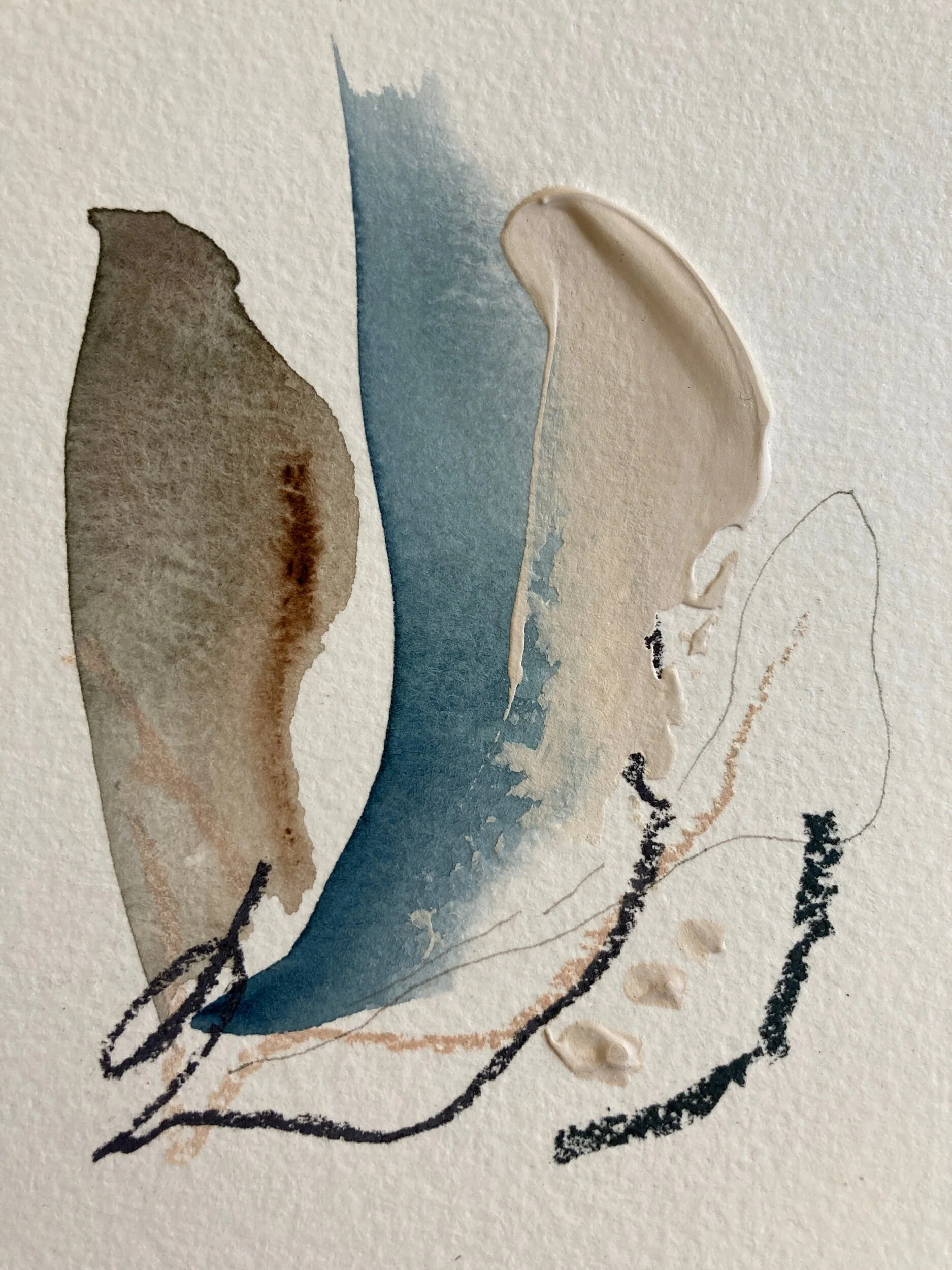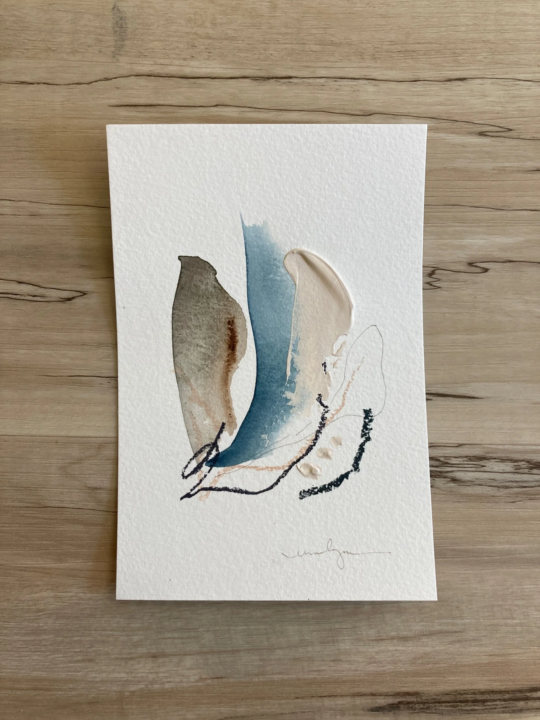 The abstract minis collection stems from a desire to streamline and perfect my process while inspiring my own creativity in a zero pressure practice. Each abstract was created in a small series with the same color palette. The process starts with a foundation of watercolor brush strokes and washes in 1-3 various pigments. The second step I take is adding line work and markings. This step is done with charcoal, pastels, or pen and ink. Each piece is completed with fun blotches of texture, bringing the piece to life, making it jump off the tiny masterpiece.